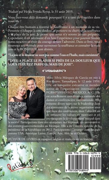 Traduit par Helda Fryeda Reyes, le 31 août 2019. Vous êtes-vous déjà demandé pourquoi il y a tant de tragédies dans votre vie ? Chaque être humain a traversé la Souffrance à un moment de sa vie. Personne n'échappe à cette douleur, et personne ne choisirait la souffrance à la place de la joie. Je pense que nous n'y serons jamais préparés. Cependant, il est nécessaire d'en faire l'expérience pour pouvoir former notre caractère et avoir du courage devant l'adversité. Dans ce livre, vous trouverez une formule pour surmonter la souffrance et connaître la vraie joie et le BONHEUR tant désirés. "La joie et la douleur ne sont pas comme l'eau et l'huile, mais coexistent". "DIEU A PLACÉ LE PLAISIR SI PRÈS DE LA DOULEUR QUE VOUS PLEUREZ PARFOIS, MAIS DE JOIE".