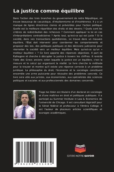 Dans l'action des trois branches du gouvernement de notre République, on trouve beaucoup de casuistique, d'intuitionnisme et d'incohérence. Il y a un manque de lignes directrices claires et prévisibles pour l'action politique. Quelle est la meilleure répartition des droits et des devoirs ? Quels sont les critères de redistribution des richesses ? Comment appliquer la loi en cas d'interprétations contradictoires ? Après tout, qu'est-ce qui est juste ? Si la société, dans ses transactions quotidiennes, se trouve dans un mauvais équilibre, l'État doit intervenir pour coordonner les comportements et proposer des lois, des politiques publiques et des décisions judiciaires pour réorienter la société vers un meilleur équilibre. Mais qu'est-ce qu'un « meilleur équilibre » ? Ce livre apporte des réponses objectives. Il part de Pythagore et cherche à décrypter la justice à travers les chiffres. Il revisite l'idée des Grecs anciens selon laquelle la justice est un équilibre, c'est la mesure et le calcul qui organisent la réalité. Le livre cherche la méthode pour la trouver et montre qu'il existe une réponse correcte à un problème juridique. La philosophie du droit, l'économie et la sociologie constituent ensemble une arme puissante pour résoudre des problèmes concrets. Ce livre sera utile aux juristes, aux économistes, aux spécialistes des sciences politiques et sociales et aux professionnels des domaines concernés.