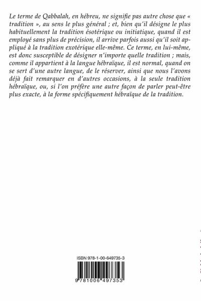 Se trouvent réunis dans ce recueil, l'intégralité des articles de René Guénon à propos de la Kabbale hébraïque. Parmi les sept articles que composent ce recueil, deux ne concernent pas spécifiquement la Kabbale hébraïque. Toutefois, on y trouvera des informations complémentaires intéressantes sur le sujet. Les deux articles en question sont La Terre Sainte et le C¿ur du Monde et Les racines des plantes . Nous avons opté pour une présentation chronologique de ces articles. Toutefois, pour les lecteurs peu familiers des notions abordées dans ceux-ci, il pourrait être bon de commencer par l'article Qabbalah . Ci-dessous, un court extrait : Le terme de Qabbalah, en hébreu, ne signifie pas autre chose que tradition , au sens le plus général ; et, bien qu'il désigne le plus habituellement la tradition ésotérique ou initiatique, quand il est employé sans plus de précision, il arrive parfois aussi qu'il soit appliqué à la tradition exotérique elle-même. Ce terme, en lui-même, est donc susceptible de désigner n'importe quelle tradition ; mais, comme il appartient à la langue hébraïque, il est normal, quand on se sert d'une autre langue, de le réserver, ainsi que nous l'avons déjà fait remarquer en d'autres occasions, à la seule tradition hébraïque, ou, si l'on préfère une autre façon de parler peut-être plus exacte, à la forme spécifiquement hébraïque de la tradition.