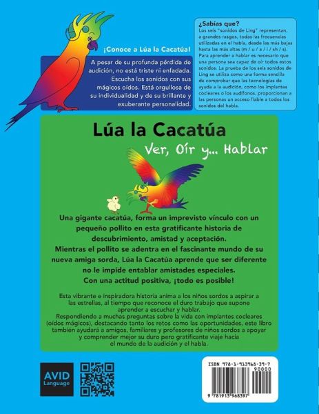 Una gigante cacatúa, forma un imprevisto vínculo con un pequeño pollito en esta gratificante historia de descubrimiento, amistad y aceptación. Mientras el pollito se adentra en el fascinante mundo de su nueva amiga sorda, Lúa la Cacatúa aprende que ser diferente no le impide entablar grandes amistades. Con una actitud positiva, ¡todo es posible! Este libro de 30 páginas, con ilustraciones a todo color, está escrito para niños de 6 a 8 años y primeros lectores. Según la experiencia personal de la autora, ésta es la edad en la que los niños con dificultades auditivas y sus amigos del colegio empiezan a interesarse por el funcionamiento de sus implantes cocleares / audífonos. La historia anima a los niños sordos a aspirar a las estrellas, al tiempo que reconoce el duro trabajo que supone aprender a escuchar y hablar. El libro utiliza un lenguaje ambicioso, lo que lo hace ideal para leer en familia y para que los oyentes más jóvenes aprendan parte de la terminología asociada a la pérdida de audición y a la tecnología auditiva. Respondiendo a muchas preguntas sobre la vida con implantes cocleares (oídos mágicos), destacando tanto los retos como las oportunidades, este inspirador libro ayudará a amigos, familiares y profesores de niños sordos a apoyar y comprender mejor su duro pero gratificante viaje hacia el mundo de la audición y el habla. Al defender a un personaje tan divertido como Lúa la Cacatúa con pérdida de audición, que no se deja intimidar por su discapacidad, se espera que este encantador cuento ayude a los niños sordos a desarrollar su autoestima, el orgullo de ser quienes son y un fuerte sentido de la identidad personal. Acerca Lúa la Cacatúa: Esta imparable cacatúa, portadora de un implante coclear, tiene la misión de inspirar a los niños sordos para que sueñen a lo grande y de ayudar a más gente a comprender tanto los retos a los que se enfrentan los niños sordos de hoy en día como las increíbles oportunidades que se les presentan. Describe las horas de terapia logopédica, la dedicación y la concentración necesarias para aprender a escuchar y hablar, al tiempo que transmite el firme mensaje de que todo el trabajo duro al final merecerá la pena. Los seis "sonidos de Ling" representan, a grandes rasgos, todas las frecuencias utilizadas en el habla (m / u / a / i / sh / s). Lúa la Cacatúa está orgullosa de sus implantes cocleares y le encanta hablar de ellos, explicar cómo funcionan y describir lo que se siente al llevarlos. Menos mal, porque el siempre curioso pollito está lleno de preguntas. Tan atrevida y descarada como sus vibrantes colores del arco iris, Lúa la Cacatúa piensa que ser diferente es muy divertido. Sin embargo, tiene que aprender algunas lecciones sobre cómo frenar su exuberante comportamiento. Así, el pequeño pollito, adquiere una nueva conciencia y comprensión, mientras que Lúa la Cacatúa aprende valiosas lecciones de amistad y aceptación. Inspirado en la terapia verbal auditiva, que enseña a los niños sordos con implantes cocleares y audífonos a escuchar y hablar, este libro reconoce que existen muchos enfoques diferentes para la comunicación de las personas sordas (incluido el lenguaje de signos, escucha y lenguaje hablado, la comunicación total). El autor respeta plenamente el hecho de que no existe un enfoque categóricamente correcto o incorrecto; la opción a seguir es una elección profundamente personal de cada familia basada en sus propios valores, aspiraciones y en lo que mejor funcione para ellos.