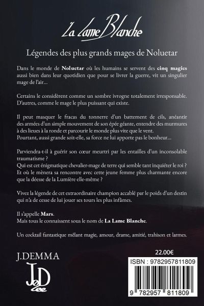 Découvrez la vie du plus grand Champion de Noluetar. Dans le monde de Noluetar où les humains se servent des cinq magies aussi bien dans leur quotidien que pour se livrer la guerre, vit un singulier mage de l'air... Certains le considèrent comme un sombre ivrogne totalement irresponsable. >Il peut masquer le fracas du tonnerre d'un battement de cils, anéantir des armées d'un simple mouvement de son épée géante, entendre des murmures à des lieues à la ronde et parcourir le monde plus vite que le vent. >Parviendra-t-il à guérir son coeur meurtri par les entailles d'un inconsolable traumatisme ? Qui est cet énigmatique chevalier-mage de terre qui semble tant inquiéter le roi ? Et où le mènera sa rencontre avec cette jeune femme plus charmante encore que la déesse de la Lumière elle-même ? Vivez la légende de cet extraordinaire champion accablé par le poids d'un destin qui n'a de cesse de lui jouer ses tours les plus infâmes. Il s'appelle Mars. Mais tous le connaissent sous le nom de La Lame Blanche. Un cocktail fantastique mêlant magie, amour, drame, amitié, trahison et larmes.