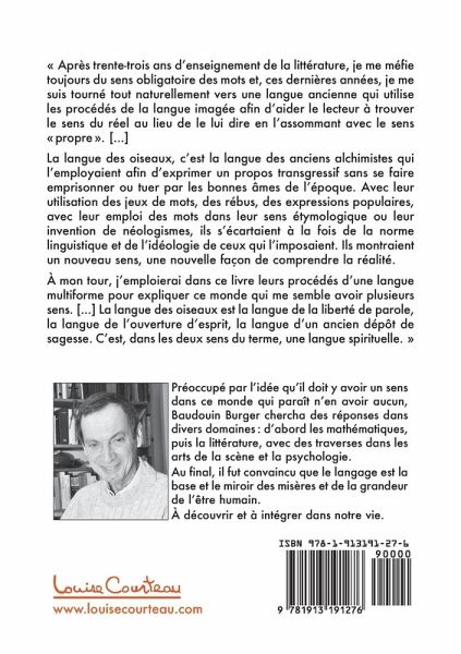 Après trente-trois ans d'enseignement de la littérature, je me méfie toujours du sens obligatoire des mots et, ces dernières années, je me suis tourné tout naturellement vers une langue ancienne qui utilise les procédés de la langue imagée afin d'aider le lecteur à trouver le sens du réel au lieu de le lui dire en l'assommant avec le sens propre . [...] La langue des oiseaux, c'est la langue des anciens alchimistes qui l'employaient afin d'exprimer un propos transgressif sans se faire emprisonner ou tuer par les bonnes âmes de l'époque. Avec leur utilisation des jeux de mots, des rébus, des expressions populaires, avec leur emploi des mots dans leur sens étymologique ou leur invention de néologismes, ils s'écartaient à la fois de la norme linguistique et de l'idéologie de ceux qui l'imposaient. Ils montraient un nouveau sens, une nouvelle façon de comprendre la réalité. À mon tour, j'emploierai dans ce livre leurs procédés d'une langue multiforme pour expliquer ce monde qui me semble avoir plusieurs sens. [...] La langue des oiseaux est la langue de la liberté de parole, la langue de l'ouverture d'esprit, la langue d'un ancien dépôt de sagesse. C'est, dans les deux sens du terme, une langue spirituelle.