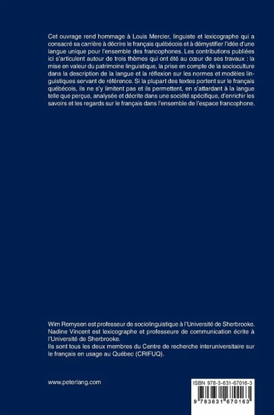 Les articles publiés dans cet ouvrage s'articulent autour de trois thèmes qui ont été au coeur de la carrière académique de Louis Mercier, à qui les auteurs rendent hommage : la mise en valeur du patrimoine linguistique, le reflet de la socioculture sur la langue et la réflexion sur les normes et modèles linguistiques.