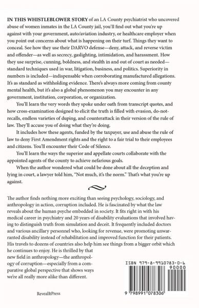 In this whistleblower story of a LA County psychiatrist who uncovered abuse of women inmates in LA County Jail, you'll find out what you're up against with your government, auto/aviation industry or health care employer when you point out concerns about what is happening on their turf. See how they use their DARVO defense - deny, attack, reverse victim and offender - as well as secrecy, gaslighting, intimidation and harassment. How they use surprise, cunning, boldness, and stealth in and out of court as needed - standard tactics used in war, litigation, business, and politics. Superiority in numbers is included - indispensable when corroborating manufactured allegations. It's as standard as withholding evidence. There's always more coming from county mental health. But it's also a global phenomenon you may encounter in any government, institution, corporation or organization. You'll learn the very words they spoke under oath from transcript quotes. And how cross-examination designed to elicit the truth, is filled with evasion, do-not-recalls, endless varieties of duping and counterattack in their version of the rule of law. It includes how these agents funded by the taxpayer use and abuse the rule of law to deny First Amendment rights and the right to a fair trial to its employees and citizens. You'll encounter their code of silence. You'll learn the ways the superior and appellate courts collaborate with the appointed agents of the county to achieve nefarious goals. When the author wondered what could be done about all the deception and lying in court, a lawyer told him, "Not much, it's the norm." That's what you're up against.