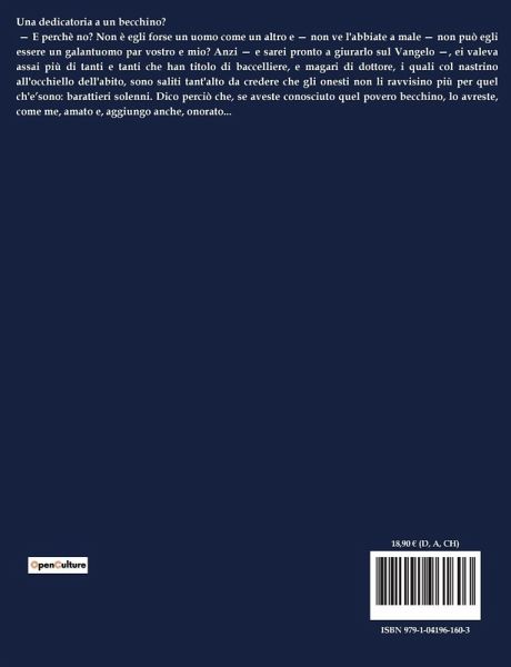 Una dedicatoria a un becchino? ¿ E perchè no? Non è egli forse un uomo come un altro e ¿ non ve l'abbiate a male ¿ non può egli essere un galantuomo par vostro e mio? Anzi ¿ e sarei pronto a giurarlo sul Vangelo ¿, ei valeva assai più di tanti e tanti che han titolo di baccelliere, e magari di dottore, i quali col nastrino all'occhiello dell'abito, sono saliti tant'alto da credere che gli onesti non li ravvisino più per quel ch'e¿sono: barattieri solenni. Dico perciò che, se aveste conosciuto quel povero becchino, lo avreste, come me, amato e, aggiungo anche, onorato...