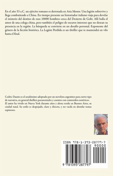 En el año 53 a.C. un ejército romano es derrotada en Asia Menor. Una legión sobrevive y llega combatiendo a China. En tiempo presente un historiador italiano viaja para develar el misterio del destino de esos 10000 hombres cerca del Desierto de Gobi. Allí halla el amor de una colega china, pero también el peligro de oscuros intereses que no desean su presencia en la región. La búsqueda se convierte en un desafío personal. Exponente del género de la ficción histórica. La Legión Perdida es un thriller que te mantendrá en vilo hasta el final.