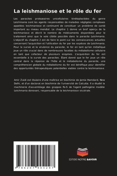 Les parasites protozoaires unicellulaires kinétoplastides du genre Leishmania sont les agents responsables de maladies négligées complexes appelées leishmaniose et continuent de constituer un problème de santé important au niveau mondial. Le chapitre 1 donne un bref aperçu de la leishmaniose et décrit le nombre de médicaments disponibles pour le traitement ainsi que la voie ciblée possible dans le parasite Leishmania. L'objectif du chapitre 2 est de faire le point sur les connaissances actuelles concernant l'acquisition et l'utilisation du fer par les espèces de Leishmania. Pour la survie et la virulence du parasite, le fer en tant qu'ion métallique joue un rôle crucial dans de nombreuses facettes du métabolisme cellulaire en tant que cofacteur de plusieurs enzymes. L'acquisition du fer est essentielle à la survie des parasites. Étant donné que le fer joue un rôle central dans la réponse de l'hôte et le métabolisme du parasite, une compréhension globale du métabolisme du fer est bénéfique pour identifier des opportunités thérapeutiques potentielles viables contre la leishmaniose.
