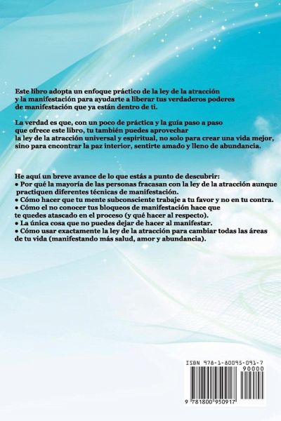 Cambia tus pensamientos, cambia tus hábitos y cambia tu vida. Todo esto a través de: ¡Los secretos comprobados de la ley de la atracción! ¿Quieres aprender más sobre la ley de la atracción, pero no sabes por dónde empezar? ¿Estás confundido debido a la sobrecarga de información sobre la ley de la atracción que hay ahí afuera? ¿Tal vez trataste de visualizar, meditar y afirmar, pero todavía no ves los resultados que deseas? ¿Te sientes abrumado cuando se trata de una teoría complicada que parece imposible de aplicar en un mundo ocupado y moderno? ¿Qué pasaría si pudieras tener una guía sencilla que destile todo lo que necesitas saber para transformar todas las áreas de tu vida: salud, relaciones, carrera, dinero? Una guía modernizada, PRÁCTICA y totalmente adaptada a las necesidades de las personas ocupadas del siglo XXI... Si has respondido afirmativamente al menos a una de las preguntas, has llegado al lugar adecuado... Este libro adopta un enfoque práctico de la ley de la atracción y la manifestación para ayudarte a liberar tus verdaderos poderes de manifestación que ya están dentro de ti. La verdad es que, con un poco de práctica y la guía paso a paso que ofrece este libro, también puedes aprovechar la ley de la atracción universal y espiritual, no solo para crear una vida mejor, sino para encontrar la paz interior, sentirte amado y lleno de abundancia. He aquí un breve avance de lo que estás a punto de descubrir: ¿Por qué la mayoría de las personas fracasan con la ley de la atracción aunque practiquen diferentes técnicas de manifestación. ¿Cómo hacer que tu mente subconsciente trabaje a tu favor y no en tu contra. ¿Cómo el no conocer tus bloqueos de manifestación hace que te quedes atascado en el proceso (y qué hacer al respecto). ¿La única cosa que no puedes dejar de hacer al manifestar. ¿Cómo usar la ley de la atracción para cambiar todas las áreas de tu vida (manifestando más salud, amor y abundancia). ¿¿Estás alejando lo que quieres por desearlo demasiado? más un simple secreto para eliminar la resistencia y poder manifestar más rápido. ¿Cómo centrar tu mentalidad, sentimientos y emociones, incluso si tu realidad 3D parece estar en tu contra (para que puedas convertirte en un ser poderoso creador de tu vida). ¿Los errores de manifestación ocultos que pueden estar impidiendo que manifiestes tu verdadero potencial. ¿Cómo el exceso de deseo puede volverse en tu contra (y qué hacer en su lugar para manifestar con alegría y facilidad). ¿Meditaciones y ejercicios para hacer que la ley de la atracción trabaje para ti y no contra ti. ¡Compra tu copia ahora mismo y empieza a transformar tu vida con la ley de la atracción!