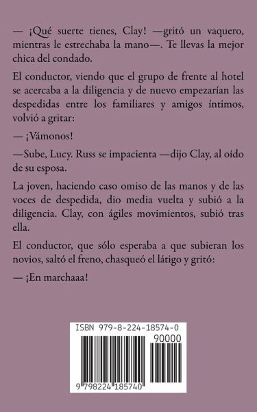 - ¡Qué suerte tienes, Clay! -gritó un vaquero, mientras le estrechaba la mano-. Te llevas la mejor chica del condado. El conductor, viendo que el grupo de frente al hotel se acercaba a la diligencia y de nuevo empezarían las despedidas entre los familiares y amigos íntimos, volvió a gritar: - ¡Vámonos! -Sube, Lucy. Russ se impacienta -dijo Clay, al oído de su esposa. La joven, haciendo caso omiso de las manos y de las voces de despedida, dio media vuelta y subió a la diligencia. Clay, con ágiles movimientos, subió tras ella. El conductor, que sólo esperaba a que subieran los novios, saltó el freno, chasqueó el látigo y gritó: - ¡En marchaaa!