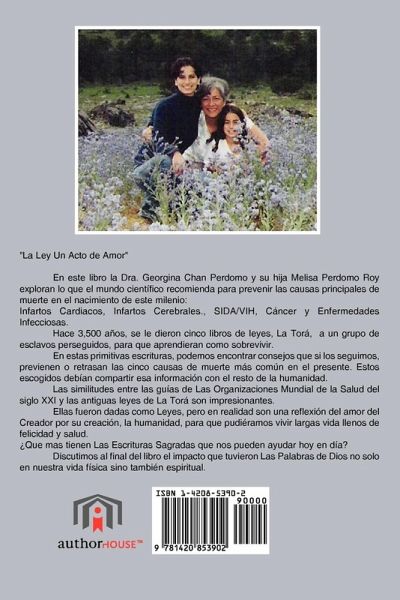 En este libro la Dra. Georgina Chan Perdomo y su hija Melisa Perdomo Roy exploran lo que el mundo científico recomienda para prevenir las causas principales de muerte en el nacimiento de este milenio: Infartos Cardiacos, Infartos Cerebrales., SIDA/VIH, Cáncer y Enfermedades Infecciosas. Hace 3,500 años, se le dieron cinco libros de leyes, La Torá, a un grupo de esclavos perseguidos, para que aprendieran como sobrevivir. En estas primitivas escrituras, podemos encontrar consejos que si los seguimos, previenen o retrazan las cinco causas de muerte más común en el presente. Estos escogidos debían compartir esa información con el resto de la humanidad. Las similitudes entre las guías de Las Organizaciones Mundial de la Salud del siglo XXI y las antiguas leyes de La Torá son impresionantes. Ellas fueron dadas como Leyes, pero en realidad son una reflexión del amor del Creador por su creación, la humanidad, para que pudiéramos vivir largas vida llenos de felicidad y salud. ¿Que mas tienen Las Escrituras Sagradas que nos pueden ayudar hoy en día? Discutimos al final del libro el impacto que tuvieron Las Palabras de Dios no solo en nuestra vida física sino también espiritual.
