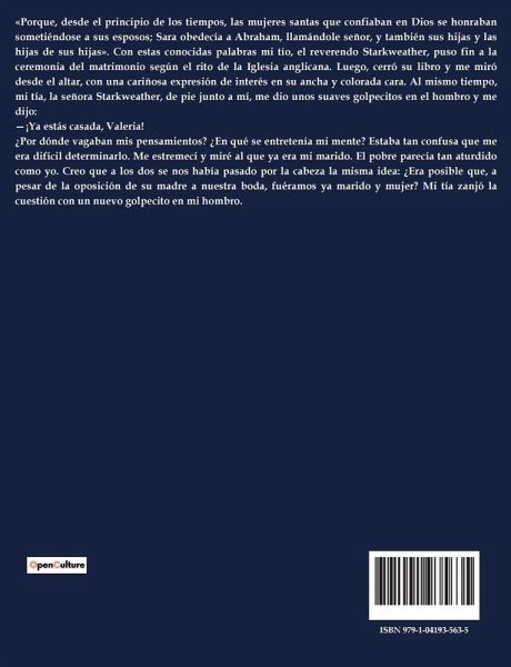 «Porque, desde el principio de los tiempos, las mujeres santas que confiaban en Dios se honraban sometiéndose a sus esposos; Sara obedecía a Abraham, llamándole señor, y también sus hijas y las hijas de sus hijas». Con estas conocidas palabras mi tío, el reverendo Starkweather, puso fin a la ceremonia del matrimonio según el rito de la Iglesia anglicana. Luego, cerró su libro y me miró desde el altar, con una cariñosa expresión de interés en su ancha y colorada cara. Al mismo tiempo, mi tía, la señora Starkweather, de pie junto a mí, me dio unos suaves golpecitos en el hombro y me dijo: ¿¡Ya estás casada, Valeria! ¿Por dónde vagaban mis pensamientos? ¿En qué se entretenía mi mente? Estaba tan confusa que me era difícil determinarlo. Me estremecí y miré al que ya era mi marido. El pobre parecía tan aturdido como yo. Creo que a los dos se nos había pasado por la cabeza la misma idea: ¿Era posible que, a pesar de la oposición de su madre a nuestra boda, fuéramos ya marido y mujer? Mi tía zanjó la cuestión con un nuevo golpecito en mi hombro.