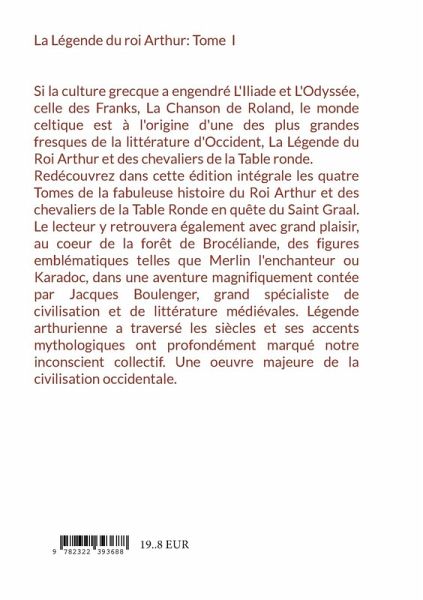 La Légende du roi Arthur: Tome I - Le roman de Merlin - Les enfances de LancelotSi la culture grecque a engendré L'Iliade et L'Odyssée, celle des Francs, La Chanson de Roland, le monde celtique est à l'origine d'une des plus grandes fresques de la littérature d'Occident, La Légende du Roi Arthur et des chevaliers de la Table ronde.Redécouvrez dans cette édition intégrale les quatre Tomes de la fabuleuse histoire du Roi Arthur et des chevaliers de la Table Ronde en quête du Saint Graal. Le lecteur y retrouvera également avec grand plaisir, au coeur de la forêt de Brocéliande, des figures emblématiques telles que Merlin l'enchanteur ou Karadoc, dans une aventure magnifiquement contée par Jacques Boulenger, grand spécialiste de civilisation et de littérature médiévales. La légende arthurienne a traversé les siècles et ses accents mythologiques ont profondément marqué notre inconscient collectif. Une oeuvre majeure de la civilisation occidentale.