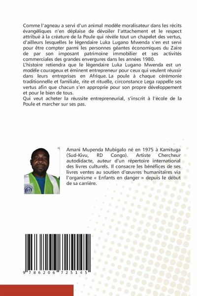 Comme l'agneau a servi d'un animal modèle moralisateur dans les récits évangéliques n'en déplaise de dévoiler l'attachement et le respect attribué à la créature de la Poule qui révèle tout un chapelet des vertus, d'ailleurs lesquelles le légendaire Luka Lugano Mwenda s'en est servi pour être compter parmi les personnes géantes économiques du Zaïre de par son imposant patrimoine immobilier et ses activités commerciales des grandes envergures dans les années 1980. L'histoire retiendra que le légendaire Luka Lugano Mwenda est un modèle courageux et éminent entrepreneur pour ceux qui veulent réussir dans leurs entreprises en Afrique. La poule à chaque cérémonie traditionnelle et familiale, rite et rituelle, circonstance Lega rappelle ses vertus afin que chacun s'en approprie pour son propre développement et pour le bien de tous. Qui veut acheter la réussite entrepreneurial, s'inscrit à l'école de la Poule et marcher sur ses pas.