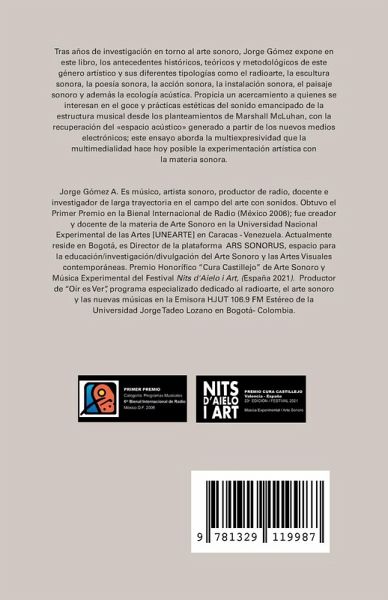 Tras años de investigación en torno al arte sonoro, Jorge Gómez expone en este libro, los antecedentes históricos, teóricos y metodológicos de este género artístico y sus diferentes tipologías como el radioarte, la escultura sonora, la poesía sonora, la acción sonora, la instalación sonora, el paisaje sonoro y además la ecología acústica. Propicia un acercamiento a quienes se interesan en el goce y prácticas estéticas del sonido emancipado de la estructura musical desde los planteamientos de Marshall McLuhan, con la recuperación del espacio acústico generado a partir de los nuevos medios electrónicos; este ensayo aborda la multiexpresividad que la multimedialidad hace hoy posible la experimentación artística con la materia sonora.