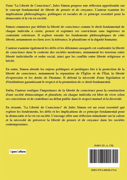 Dans "La Liberté de Conscience", Jules Simon propose une réflexion approfondie sur le concept fondamental de liberté de pensée et de croyance. L'auteur examine les implications philosophiques, politiques et sociales de ce principe essentiel pour la démocratie et la vie en société. Simon commence par définir la liberté de conscience comme le droit fondamental de chaque individu à croire, penser et exprimer ses convictions sans ingérence ni contrainte extérieure. Il explore ensuite les fondements philosophiques de cette liberté, notamment ses liens avec la tolérance, le pluralisme et la dignité humaine. L'auteur examine également les défis et les dilemmes auxquels est confrontée la liberté de conscience dans le contexte des sociétés modernes, notamment les tensions entre liberté individuelle et ordre social, ainsi que les conflits entre liberté religieuse et laïcité. En outre, Simon aborde les enjeux politiques et juridiques liés à la protection de la liberté de conscience, notamment la séparation de l'Église et de l'État, la liberté d'expression et les droits de l'homme. Il défend la nécessité d'une législation et d'institutions garantissant le respect et la promotion de ce droit fondamental. Enfin, l'auteur souligne l'importance de la liberté de conscience pour la construction d'une société démocratique et pluraliste, où chaque individu est libre de vivre selon ses convictions et de contribuer au débat public dans le respect mutuel et la diversité. En résumé, "La Liberté de Conscience" de Jules Simon est un essai essentiel qui explore les fondements, les défis et les implications de ce principe fondamental pour la démocratie et la vie en société. L'ouvrage offre une réflexion stimulante sur la valeur et la nécessité de préserver la liberté de pensée et de croyance dans les sociétés contemporaines.