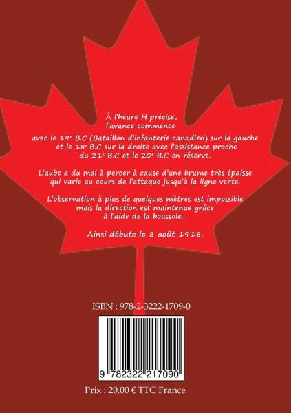 "A l'heure H précise, l'avance commence avec le 19e B.C (bataillon d'infanterie canadien) sur la gauche et le 18e B.C sur la droiteavec l'assistance proche du 21e B.C et le 20e B.C en réserve. L'aube a du mal à percer à cause d'une brume très épaisse qui varie au cours de l'attaque jusqu'à la ligne verte.L'observation à plus de quelques mètres est impossible mais la direction est maintenue grâce à l'aide de la boussole..."Ainsi débute le 08 août 1918, la bataille d'Amiens qui va libérer le premier village : Marcelcave.Les cents jours suivants mèneront à l'Armistice et à la fin de la guerre.D'après la traduction la plus fidèle des journaux de guerre;les préparatifs et le jour de la libération, par ces héros dont certains ont donné leur vie et sont enterrés dans les cimetières avoisinants.