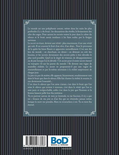 Le monde est une polyphonie sonore, même dans les nuits les plus profondes il y a du bruit : les discussions des étoiles, le froissement des ailes des anges. Il y a deux sortes de bruits, le bruit agréable qui permet d'agir et de penser dans le calme et avec toute son efficience ; et le bruit désagréable, qui ne communique aucun message et contre lequel on éprouve sa patience en attendant qu'il cesse. Pour autant les secrets voient le jour dans le calme du silence et le bruit aurait tendance à les faire trahir, par la fatigue nerveuse.Le secret en étant, devient une vérité ; plus exactement, il est une vérité qui naît. Il est souvent le fruit d'un rêve, d'un désir... Tout le processus de la quête les laisse fleurir et apparaitre naturellement. C'est une des lois du monde : en cherchant, on désire ; en désirant on crée des besoins, et les secrets deviennent des secrets prêts à être dévoilés le plus tard possible. Quel est le degré de tristesse, de désappointement ou de joie lorsque l'on le dévoile ? Un secret peut-il rester secret éternel ou transpire t'il sur les parois du monde ? Et devenir une vague de nouvelles réalités. Le secret ne proposerait-il pas une vague de renouvellement et par là-même nécessaire à la réalité surprenante de chaque jour.La joie n'a pas de maître, elle apparait, bizarrement, soudainement tant dans le bruit que dans le silence. Elle fait chanter la réalité, le sourire, le rire deviennent l'essentiel...La joie existe chez toutes les populations du monde, et quand certains sourient à la vision d'un arc-en-ciel c'est qu'ils ont le coeur bien ouvert sur le monde. Le monde a été conçu dans sa beauté pour offrir de la joie.Le silence, le bruit, le secret, la vérité et la joie sont des éléments empreints d'une dynamique de feu, qui parfois se rattache aux passions : c'est dans le silence que l'on aime s'aimer, c'est dans le bruit que l'on aime le silence qui revient à nouveau, c'est dans la vérité que l'on se sent juste et irréprochable, enfin c'est dans la joie que l'homme et la femme laissent jaillir leur feu intérieur.Tu es partout autour de moi, je t'entends, tu me fascines, il n'y a que toi ; Source de ma joie et d'un feu qui ne s'éteindra jamais même lorsque la mort me prendra. Rien ne m'arrachera à toi. Tu es mon feu éternel.