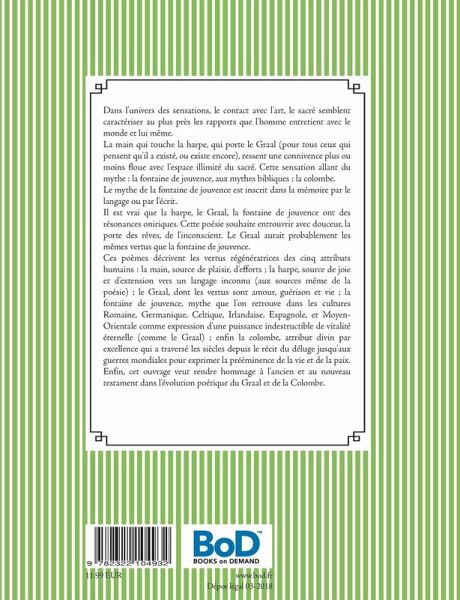 Dans l'univers des sensations, le contact avec l'art, le sacré semblent caractériser au plus près les rapports que l'homme entretient avec le monde et lui même.Bien plus encore, lorsque la sensation s'aiguise en devenant perception. Si l'être humain éprouve des sensations, il les ressent et les traduit par des perceptions cognitives, ou tout simplement sensuelles.La main qui touche la harpe, qui porte le Graal (pour tous ceux qui pensent qu'il a existé, ou existe encore), ressent une connivence plus ou moins floue avec l'espace illimité du sacré. Cette sensation allant du mythe : la fontaine de jouvence, aux mythes bibliques : la colombe.La poésie oscille du mythe au symbole dans le but de l'apprentissage et du plaisir sonore, comme un chant. Ce qu'était la poésie dans ses prémisses.Le mythe de la fontaine de jouvence est inscrit dans la mémoire par le langage ou par l'écrit.Les Écritures bibliques, nous apprennent la métaphore de la colombe, à la fois mythe, à la fois symbole.Il est vrai que la harpe, le Graal, la fontaine de jouvence ont des résonances oniriques. Cette poésie souhaite entrouvrir avec douceur, la porte des rêves, de l'inconscient. La fontaine de jouvence qui a donné naissance au triptyque de Jérôme Bosch en 1504 : Le jardin des délices. Le Graal aurait probablement les mêmes vertus que la fontaine de jouvence.Ces poèmes décrivent les vertus régénératrices des cinq attributs humains : la main, source de plaisir, d'efforts ; la harpe, source de joie et d'extension vers un langage inconnu (aux sources même de la poésie) ; le Graal, dont les vertus sont amour, guérison et vie ; la fontaine de jouvence, mythe que l'on retrouve dans les cultures Romaine, Germanique, Celtique, Irlandaise, Espagnole, et Moyen-Orientale comme expression d'une puissance indestructible de vitalité éternelle (comme le Graal) ; enfin la colombe, attribut divin par excellence qui a traversé les siècles depuis le récit du déluge jusqu'aux guerres mondiales pour exprimer la prééminence de la vie et de la paix.Enfin, cet ouvrage veut rendre hommage à l'ancien et au nouveau testament dans l'évolution poétique du Graal et de la Colombe. À vous de découvrir, qui est la femme et qui est le roi ...