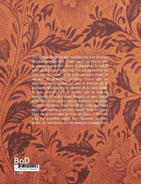 Tes mains chaudes me conduisent à te désirer de plus en plus fort. Cette envie est tracée par le premier sourire. Alors je découvre le soleil près de toi, puis l'étreinte. En cet instant je ne vois que tes yeux, et je prie qu'enfin cesse le silence, je demande pardon, parce que ce délicat sourire anime en moi le frisson de la passion. Alors après le silence de la nuit, jaillit la joie d'écrire. Et je monte sur le bateau enchanté. Et si je t'aime jusqu'à ce que l'aube s'en aille, c'est parce que je repense à la pluie de mon enfance. Tous les deux nous pouvons dire : « le matin a encore chanté dans l'espace bleu de la nuit que le vent déchire. » Et tout cela est possible parce que l'homme de mes nuits, de mes jours est un homme comme toi.