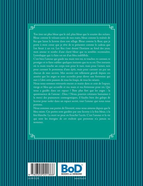 Ton âme est plus bleue que le ciel, plus bleue que le sourire des océans. Bleue comme le velours-satin de mes nuits, bleue comme la traînée de feu que laisse la licorne dans son sillage. Bleue comme la fleur, que je porte à mon coeur que je rêve de te présenter comme le cadeau que l'on ferait à un roi. Les fées t'ont donné l'horizon au fond des yeux, mon amour te nimbe d'une clarté bleue que tu sembles reconnaître. L'enveloppe qui t'a faite roi est d'un bleu indélébile.C'est bien l'amour qui guide ma main vers toi, te toucher, te caresser, te protéger et te faire oublier quelques instants que tu es roi. Des instants où ta main touche un corps non pour le tuer, mais pour l'aimer, non pour caresser le pommeau d'une épée, mais pour caresser un par un chacun de mes secrets. Mes secrets ont tellement grandi depuis ces années que les anges se sont accordés pour élever une forteresse qui met à l'abri cette passion de tous les loups, de tous les néants.Nous nous sommes retrouvés encore ce matin dans ce coin de l'espace, vierge et bleu qui accueille et ma main et ma forteresse pour toi. Qui nous a guidés dans cet espace ? Bien plus fort que les anges : la quintessence de l'amour : Dieu ? Nous, pauvres créatures humaines à la merci des puissances cosmogoniques, il faudra bien des galops de licorne pour isoler dans un espace secret, tout l'amour que nous nous portons.Nous sommes aux portes de l'éternité, nous nous aimons depuis que le bleu existe. Ces portes sont gardées par une licorne à la fois bleue, à la fois blanche. La mort ne peut en franchir l'accès. C'est l'amour et la vie qui sont les énergies de cet endroit que personne n'a jamais su nommer.