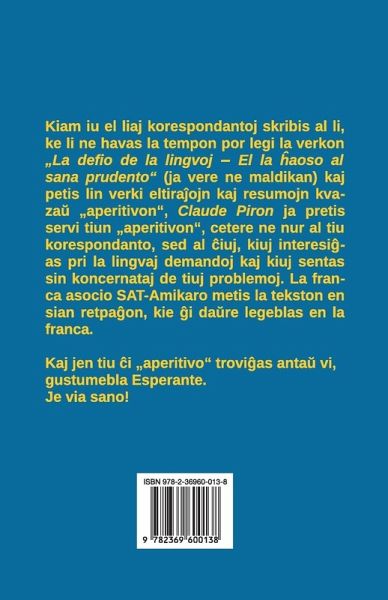 Kiam iu el liaj korespondantoj skribis al li, ke li ne havas la tempon por legi la verkon ¿La defio de la lingvoj ¿ El la ¿aoso al sana prudento" (ja vere ne maldikan) kaj petis lin verki eltiräojn kaj resumojn kvazä ¿aperitivon", Claude Piron ja pretis servi tiun ¿aperitivon", cetere ne nur al tiu korespondanto, sed al ¿iuj, kiuj interesi¿as pri la lingvaj demandoj kaj kiuj sentas sin koncernataj de tiuj problemoj. La franca asocio SAT-Amikaro metis la tekston en sian retpäon, kie ¿i däre legeblas en la franca. Kaj jen tiu ¿i ¿aperitivo" trovi¿as antä vi, gustumebla Esperante. Dum legado, sanon al vi!
