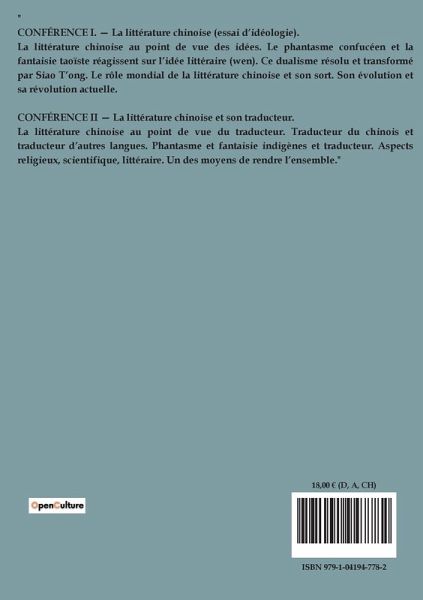 " CONFÉRENCE I. ¿ La littérature chinoise (essai d¿idéologie). La littérature chinoise au point de vue des idées. Le phantasme confucéen et la fantaisie taoïste réagissent sur l¿idée littéraire (wen). Ce dualisme résolu et transformé par Siao T¿ong. Le rôle mondial de la littérature chinoise et son sort. Son évolution et sa révolution actuelle. CONFÉRENCE II ¿ La littérature chinoise et son traducteur. La littérature chinoise au point de vue du traducteur. Traducteur du chinois et traducteur d¿autres langues. Phantasme et fantaisie indigènes et traducteur. Aspects religieux, scientifique, littéraire. Un des moyens de rendre l¿ensemble."