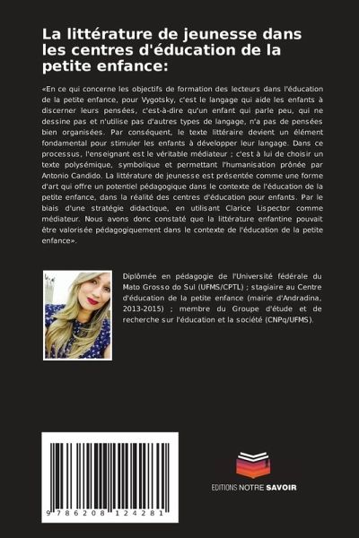 «En ce qui concerne les objectifs de formation des lecteurs dans l'éducation de la petite enfance, pour Vygotsky, c'est le langage qui aide les enfants à discerner leurs pensées, c'est-à-dire qu'un enfant qui parle peu, qui ne dessine pas et n'utilise pas d'autres types de langage, n'a pas de pensées bien organisées. Par conséquent, le texte littéraire devient un élément fondamental pour stimuler les enfants à développer leur langage. Dans ce processus, l'enseignant est le véritable médiateur ; c'est à lui de choisir un texte polysémique, symbolique et permettant l'humanisation prônée par Antonio Candido. La littérature de jeunesse est présentée comme une forme d'art qui offre un potentiel pédagogique dans le contexte de l'éducation de la petite enfance, dans la réalité des centres d'éducation pour enfants. Par le biais d'une stratégie didactique, en utilisant Clarice Lispector comme médiateur. Nous avons donc constaté que la littérature enfantine pouvait être valorisée pédagogiquement dans le contexte de l'éducation de la petite enfance».