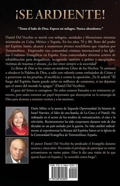 ¡SE ARDIENTE! "Toma el lado de Dios. Espera un milagro. Nunca abandones." Daniel Del Vecchio se movió con milagros, sanidades y liberaciones mientras ministraba en Cuba, México y España. En los años 70 y 80, lleno del poder del Espíritu Santo, alcanzó a numerosos jóvenes mochileros que viajaban por Torremolinos. Emprendió una comunidad cristiana internacional y las Iglesias Cristianas Evangélicas en España. Estas comunidades abrieron centros de rehabilitación para drogadictos, recogiendo también a pobres y marginados, víctimas de traumas y abusos. ¡La luz vence siempre a la oscuridad! La llama de Dios se lee como un moderno Libro de los Hechos. Te animará a obedecer la Palabra de Dios, a salir con valentía como embajador de Cristo y a perseverar en las pruebas, el sacrificio y contra la oposición. ¡Tu fe arderá! "El fuego del Espíritu Santo puede arder en millones de corazones, si no dejamos que el amor del mundo lo apague" (Daniel Del Vecchio). El gozo del Señor es contagioso. No todos estamos llamados a ser misioneros pioneros, pero todos tenemos un papel importante que desempeñar en la estrategia de Dios para alcanzar a nuestros vecinos y a las naciones.