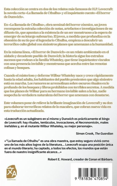 Esta colección se centra en dos de los relatos más famosos de H.P. Lovecraft: la novela corta La llamada de Cthulhu y el inquietante cuento El horror de Dunwich. En La llamada de Cthulhu, obra seminal del horror cósmico, un joven recompone la extraña colección de notas, artefactos e investigaciones de su difunto tío, que apuntan a la existencia de un ser monstruoso a la espera de emerger de su letargo submarino. El joven, a medida que profundiza en la obsesión de su tío por el legendario Cthulhu, empieza a descubrir un terrorífico culto global con siniestros planes que amenazan a la humanidad. En la misma línea, El horror de Dunwich es un relato ambientado en el aislado y decadente pueblo de Dunwich; la historia sigue los extraños sucesos que rodean a la familia Whateley, que tiene inquietantes vínculos con una presencia invisible y monstruosa que acecha entre las remotas colinas y bosques. Cuando el misterioso y deforme Wilbur Whateley nace y crece rápidamente hasta la edad adulta, los habitantes del pueblo presienten que algo siniestro está en marcha. Los rumores se arremolinan sobre oscuros rituales en lo profundo de los bosques y libros prohibidos con terribles secretos. A medida que los planes de Wilbur para su hermano invisible salen a la luz, nadie sospecha la verdadera naturaleza del horror que amenaza con desatarse. Este volumen pone de relieve la brillante imaginación de Lovecraft y su don para elaborar terroríficos relatos de lo macabro, que cobran nueva vida en esta traducción actualizada.