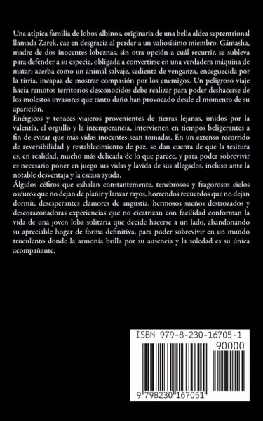 Una atípica familia de lobos albinos, originaria de una bella aldea septentrional llamada Zarek, cae en desgracia al perder a un valiosísimo miembro. Gámasha, madre de dos inocentes lobeznas, sin otra opción a cuál recurrir, se subleva para defender a su especie, obligada a convertirse en una verdadera máquina de matar: acerba como un animal salvaje, sedienta de venganza, enceguecida por la tirria, incapaz de mostrar compasión por los enemigos. Un peligroso viaje hacia remotos territorios desconocidos debe realizar para poder deshacerse de los molestos invasores que tanto daño han provocado desde el momento de su aparición. Enérgicos y tenaces viajeros provenientes de tierras lejanas, unidos por la valentía, el orgullo y la intemperancia, intervienen en tiempos beligerantes a fin de evitar que más vidas inocentes sean tomadas. En un extenso recorrido de reversibilidad y restablecimiento de paz, se dan cuenta de que la tesitura es, en realidad, mucho más delicada de lo que parece, y para poder sobrevivir es necesario poner en juego sus vidas y lavida de sus allegados, incluso ante la notable desventaja y la escasa ayuda. Álgidos céfiros que exhalan constantemente, tenebrosos y fragorosos cielos oscuros que no dejan de plañir y lanzar rayos, horrendos recuerdos que no dejan dormir, desesperantes clamores de angustia, hermosos sueños destrozados y descorazonadoras experiencias que no cicatrizan con facilidad conforman la vida de una joven loba solitaria que decide hacerse a un lado, abandonando su apreciable hogar de forma definitiva, para poder sobrevivir en un mundo truculento donde la armonía brilla por su ausencia y la soledad es su única acompañante.