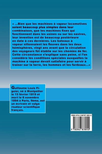 ...Bien que les machines à vapeur locomotives soient beaucoup plus simples dans leur combinaison, que les machines fixes qui fonctionnent dans les usines ou sur les navires, leur invention est de beaucoup postérieure en date à ces dernières. Les bateaux à vapeur sillonnaient les fleuves dans les deux hémisphères, vingt ans avant que la circulation des voyageurs fût établie sur les chemins de fer. Cette circonstance s'explique sans peine, si l'on considère les conditions spéciales auxquelles la machine à vapeur devait satisfaire pour servir à traîner sur la terre, les hommes et les fardeaux...