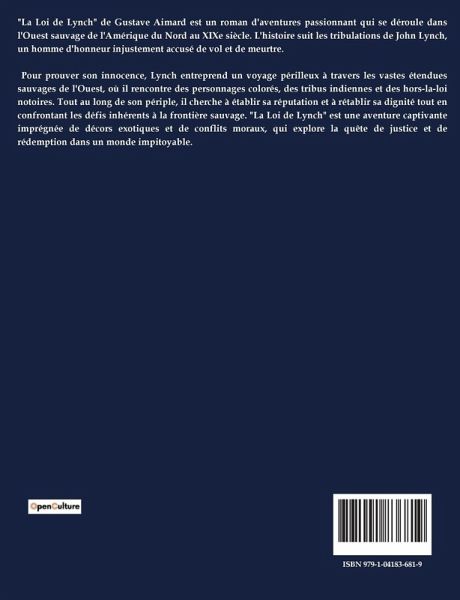 "La Loi de Lynch" de Gustave Aimard est un roman d'aventures passionnant qui se déroule dans l'Ouest sauvage de l'Amérique du Nord au XIXe siècle. L'histoire suit les tribulations de John Lynch, un homme d'honneur injustement accusé de vol et de meurtre. Pour prouver son innocence, Lynch entreprend un voyage périlleux à travers les vastes étendues sauvages de l'Ouest, où il rencontre des personnages colorés, des tribus indiennes et des hors-la-loi notoires. Tout au long de son périple, il cherche à établir sa réputation et à rétablir sa dignité tout en confrontant les défis inhérents à la frontière sauvage. "La Loi de Lynch" est une aventure captivante imprégnée de décors exotiques et de conflits moraux, qui explore la quête de justice et de rédemption dans un monde impitoyable.