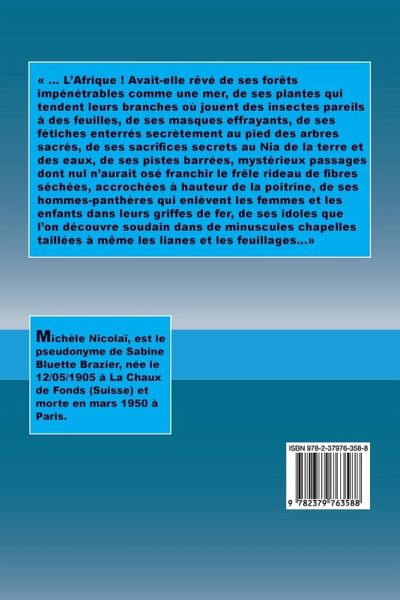 ... L'Afrique ! Avait-elle rêvé de ses forêts impénétrables comme une mer, de ses plantes qui tendent leurs branches où jouent des insectes pareils à des feuilles, de ses masques effrayants, de ses fétiches enterrés secrètement au pied des arbres sacrés, de ses sacrifices secrets au Nia de la terre et des eaux, de ses pistes barrées, mystérieux passages dont nul n'aurait osé franchir le frêle rideau de fibres séchées, accrochées à hauteur de la poitrine, de ses hommes-panthères qui enlèvent les femmes et les enfants dans leurs griffes de fer, de ses idoles que l'on découvre soudain dans de minuscules chapelles taillées à même les lianes et les feuillages...