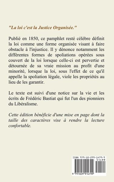 "La loi c'est la Justice Organisée." Publié en 1850, ce pamphlet resté célèbre définit la loi comme une forme organisée visant à faire obstacle à l'injustice. Il y dénonce notamment les différentes formes de spoliations opérées sous couvert de la loi lorsque celle-ci est pervertie et détournée de sa vraie mission au profit d'une minorité, lorsque la loi, sous l'effet de ce qu'il appelle la spoliation légale, viole les propriétés au lieu de les garantir. Le texte est suivi d'une notice sur la vie et les écrits de Frédéric Bastiat qui fut l'un des pionniers du Libéralisme. Cette édition bénéficie d'une mise en page dont la taille des caractères vise à rendre la lecture confortable.