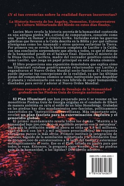 ¿Y si tus creencias sobre la realidad fueran incorrectas? La Historia Secreta de los Ángeles, Demonios, Extraterrestres y la Cultura Militarizada del Miedo en estos días finales. Lucien Mars revela la historia secreta de la humanidad contenida en una antigua piedra ME, o cristal de computadora, conocido como una "piedra en llamas" o crónica GirKu. Incluidas están las guerras galácticas que llevaron a la Caída descrita en la Biblia y por qué culturas alienígenas como los Anunnaki y otros quieren esclavizar la Tierra. Por primera vez se revela la historia completa de Lucifer y la Caída, con una conclusión sorprendente que afecta a todos, ya que el destino de la humanidad pende en el balance final. Descubre el misterio de la Diosa Oscura, Lucifera, madre del recreador genético conocido como Lucifer, que juega un papel principal en este drama cósmico. El libro proporciona una exposición demoledora que explica cómo los Illuminati estaban genéticamente relacionados con Lucifer y engendraron el Nuevo Orden Mundial socio-fascista. El contenido puede impactar tus concepciones de la realidad, ya que las últimas piezas del rompecabezas cósmico se están instituyendo para despoblar el planeta y recolonizarlo con una raza híbrida de super humanoides, diseñados para servir y adorar al Nuevo Orden Mundial. ¿Cómo responderás al Aviso de Desalojo de la Humanidad grabado en las Piedras Guía de Georgia anónimas? El Plan Illuminati que han preparado para ti se resume en las monolíticas Piedras Guía de Georgia erigidas en el condado de Elbert de manera anónima en 1979 al estilo de un falso Stonehenge. Grabadas en las piedras hay diez mandamientos neo-fascistas, políticamente convertidos en "instrucciones" orwellianas. Más importante aún, revelan un plan fascista para la exterminación eugénica y el genocidio global. El primer mandamiento revela todos los demás: "Mantén a la humanidad bajo 500,000,000 en equilibrio perpetuo con la naturaleza". Dado que la población mundial ahora se sitúa en 7.8 mil millones, ¿qué se hará con los 7.3 mil millones prescindibles? La respuesta alienígena parece la más obvia: Primero instituir la integración de especies, seguido de la asimilación militarizada y la hibridación final de 500,000,000 de extraterrestres a lo largo del tiempo y exterminar sistemáticamente al resto. Ese es el Plan, tallado en piedra para que todos lo vean. Entonces, la pregunta sigue siendo: ¿Son las piedras guía de la humanidad, o las lápidas? Descúbrelo adentro...