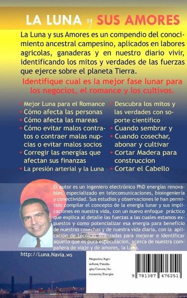 "The Moon and its Loves" is a fabulous, innovative and practical book. It is a compendium of ancestral peasant knowledge, applied in agricultural work, livestock, and in our daily lives, identifying the myths and truths of the forces it exerts on Earth and all living beings on this planet. It describes how to use the energy of the moon to facilitate business, harvest, improve health, and ensure an outstanding romance, with the most energetically compatible person. *** ESPAÑOL *** "La Luna y sus Amores" es un libro fabuloso, innovador y práctico. Es un compendio del conocimiento ancestral campesino, aplicado en el trabajo agrícola, ganadero y en nuestra vida cotidiana, identificando los mitos y verdades de las fuerzas que la luna ejerce sobre el planeta Tierra y sobre todos los seres vivos que la habitamos. Describe cómo usar la energía de la luna a nuestro favor para facilitar los negocios, las cosechas, mejorar la salud y asegurar un buen romance, con la persona más afín energéticamente.