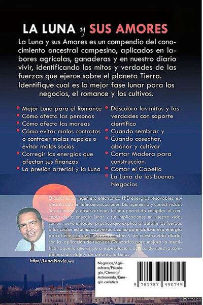 "The Moon and its Love" is a fabulous, innovative, and practical book. It is a compendium of ancestral peasant knowledge, applied in agricultural and livestock work and in our daily lives, identifying the myths and truths of the forces it exerts on planet Earth. It describes how to use the energy of the moon to facilitate business or harvest, to improve health or romance. *** ESPAÑOL / SPANISH *** "La Luna y sus Amores" es un libro fabuloso, innovador y práctico. Es un compendio del conocimiento ancestral campesino, aplicados en labores agrícolas, ganaderas y en nuestro diario vivir, identificando los mitos y verdades de las fuerzas que ejerce sobre el planeta Tierra. Describe como usar la energía de la luna para facilitar los negocios o para cosechar, para mejorar la salud, o para el romance.