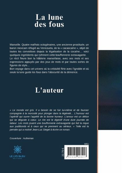 Marseille. Quatre malfrats octogénaires, une ancienne prostituée, un baron mexicain réfugié au Venezuela, de la « cacaocaïne », objet de toutes les convoitises depuis la légalisation de la cocaïne¿ voici quelques ingrédients qui rythment cette bouffonnerie extravagante. Le récit fleure bon la hâblerie marseillaise, avec ses mots et ses expressions appuyés par des jeux de mots et par toutes sortes de figures de style¿ Bon voyage dans cet univers où la crédulité flirte avec l¿ignoble et où seule la lune guide les fous dans l¿obscurité de la démence.