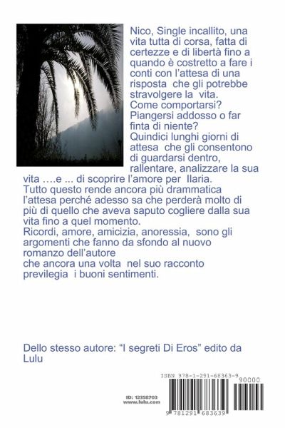 Nico, Single incallito, una vita tutta di corsa, fatta di certezze e di libertà fino a quando è costretto a fare i conti con l'attesa di una risposta che gli potrebbe stravolgere la vita. Come comportarsi? Piangersi addosso o far finta di niente? Quindici lunghi giorni di attesa che gli consentono di guardarsi dentro, rallentare, analizzare la sua vita ....e .. di scoprire l'amore per Ilaria. Tutto questo rende ancora più drammatica l'attesa perché adesso sa che perderà molto di più di quello che aveva saputo cogliere dalla sua vita fino a quel momento. Ricordi, amore, amicizia, anoressia, sono gli argomenti che fanno da sfondo al nuovo romanzo dell'autore che ancora una volta nel suo racconto previlegia i buoni sentimenti.