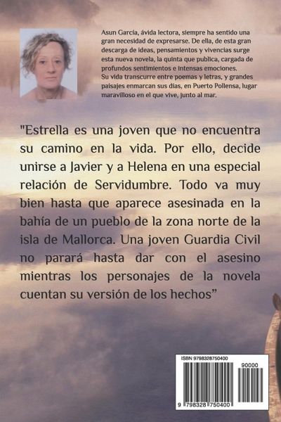 "Estrella es una joven que no encuentra su camino en la vida. Por ello, decide unirse a Javier y a Helena en una especial relación de "servidumbre" Todo va muy bien hasta que aparece asesinada en la bahía de un pueblo de la zona norte de la isla de Mallorca. Una joven Guardia Civil no parará hasta dar con el asesino mientras los personajes de la novela cuentan su versión de los hechos"
