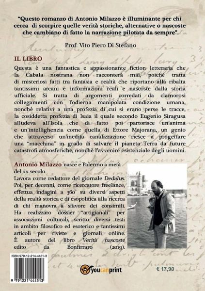Trattasi di un'inedita e appassionante fiction storica che presto diventerà un film per i suoi misteriosi episodi e fenomeni tra realtà e fantasia che intendono riportare alla ribalta una Profezia di cui qualcuno ha fatto perdere le tracce.. Profezia anticamente sostenuta da un noto "contattista" siciliano ed in seguito da una nobile anima in missione sulla terra venuta a conoscenza che la straordinaria opera della divina "macchina" di Ettore Majorana è stata occultata in quanto rispondeva ai requisiti di questa Profezia, ovvero: per difendere gli uomini dalla manipolata crisi economica e salvare il pianeta terra da alcuni adulterati fenomeni atmosferici voluti e programmati; da chi, con questo voluto occulto processo di decadimento della civiltà ne trae un nutrimento energetico! Dunque, una storia illustrata e sviluppata da una nuova creatività che attraverso una sequenza di aspetti esoterici e soprattutto di esopolitica (forse mai trattati dalla limitata kultura contemporanea), farà luce finalmente su alcune inedite ingerenze che in questi ultimi anni stanno sviluppando l'attuale sofferenza umana che ha invaso l'intero pianeta terra!