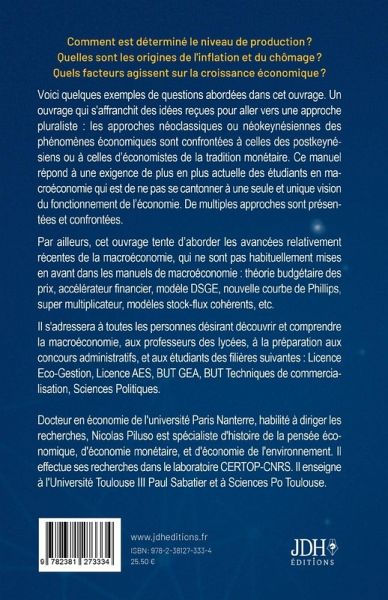 Comment est déterminé le niveau de production¿? Quelles sont les origines de l'inflation et du chômage¿? Quels facteurs agissent sur la croissance économique¿? Voici quelques exemples de questions abordées dans cet ouvrage. Un ouvrage qui s'affranchit des idées reçues pour aller vers une approche pluraliste : les approches néoclassiques ou néokeynésiennes des phénomènes économiques sont confrontées à celles des postkeynésiens ou à celles d¿économistes de la tradition monétaire. Ce manuel répond à une exigence de plus en plus actuelle des étudiants en macroéconomie qui est de ne pas se cantonner à une seule et unique vision du fonctionnement de l¿économie. De multiples approches sont présentées et confrontées. Par ailleurs, cet ouvrage tente d¿aborder les avancées relativement récentes de la macroéconomie, qui ne sont pas habituellement mises en avant dans les manuels de macroéconomie : théorie budgétaire des prix, accélérateur financier, modèle DSGE, nouvelle courbe de Phillips, super multiplicateur, modèles stock-flux cohérents, etc. Il s'adressera à toutes les personnes désirant découvrir et comprendre la macroéconomie, aux professeurs des lycées, à la préparation aux concours administratifs, et aux étudiants des filières suivantes : Licence Eco-Gestion, Licence AES, BUT GEA, BUT Techniques de commercialisation, Sciences Politiques. Docteur en économie de l'université Paris Nanterre, habilité à diriger les recherches, Nicolas Piluso est spécialiste d'histoire de la pensée économique, d'économie monétaire, et d'économie de l'environnement. Il effectue ses recherches dans le laboratoire CERTOP-CNRS. Il enseigne à l'Université Toulouse III Paul Sabatier et à Sciences Po Toulouse.