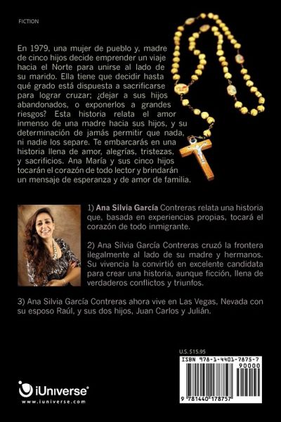 En 1979 una mujer de pueblo, madre de cinco hijos decide emprender un viaje hacia el Norte para unirse al lado de su marido. Ella tiene que decidir hasta que grado esta dispuesta a sacrificarse para lograr cruzar. Dejar a sus hijos atras, o exponerlos a grandes riesgos? Esta historia relata el amor inmenzo de una madre para sus hijos, y su determinacion de jamas permitir que nada ni nadie los separe. Te embarcaras en una historia llena de amor, alegrias, tristesas y sacrificios. Ana Maria y sus cinco hijos tocaran el corazon de todo lector y brindaran un mensaje de esperanza y de amor de familia.