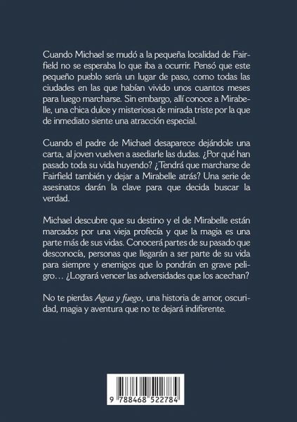 Cuando Michael se mudó a la pequeña localidad de Fairfield no se esperaba lo que iba a ocurrir. Pensó que este pequeño pueblo sería un lugar de paso, como todas las ciudades en las que habían vivido unos cuantos meses para luego marcharse. Sin embargo, allí conoce a Mirabelle, una chica dulce y misteriosa de mirada triste por la que de inmediato siente una atracción especial. Cuando el padre de Michael desaparece dejándole una carta, al joven vuelven a asediarle las dudas. ¿Por qué han pasado toda su vida huyendo? ¿Tendrá que marcharse de Fairfield también y dejar a Mirabelle atrás? Una serie de asesinatos darán la clave para que decida buscar la verdad. Michael descubre que su destino y el de Mirabelle están marcados por una vieja profecía y que la magia es una parte más de sus vidas. Conocerá partes de su pasado que desconocía, personas que llegarán a ser parte de su vida para siempre y enemigos que lo pondrán en grave peligro… ¿Logrará vencer las adversidades que los acechan? No te pierdas Agua y fuego, una historia de amor, oscuridad, magia y aventura que no te dejará indiferente.