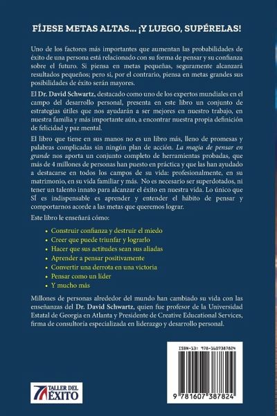 FÍJESE METAS ALTAS... ¡Y LUEGO, SUPÉRELAS! Uno de los factores más importantes que aumentan las probabilidades de éxito de una persona está relacionado con su forma de pensar y su confianza sobre el futuro. Si piensa en metas pequeñas, seguramente alcanzará resultados pequeños; pero si, por el contrario, piensa en metas grandes sus posibilidades de éxito serán mayores. El Dr. David Schwartz, destacado como uno de los expertos mundiales en el campo del desarrollo personal, presenta en este libro un conjunto de estrategias útiles que nos ayudarán a ser mejores en nuestro trabajo, en nuestra familia y más importante aún, a encontrar nuestra propia definición de felicidad y paz mental. El libro que tiene en sus manos no es un libro más, lleno de promesas y palabras complicadas sin ningún plan de acción. La magia de pensar en grande nos aporta un conjunto completo de herramientas probadas, que más de 4 millones de personas han puesto en práctica y que las han ayudado a destacarse en todos los campos de su vida: profesionalmente, en su matrimonio, en su vida familiar y más. No es necesario ser superdotados, ni tener un talento innato para alcanzar el éxito en nuestra vida. Lo único que SÍ es indispensable es aprender y entender el hábito de pensar y comportarnos acorde a las metas que queremos lograr. Este libro le enseñará cómo:Construir con¿anza y destruir el miedo Creer que puede triunfar y lograrlo Hacer que sus actitudes sean sus aliadas Aprender a pensar positivamente Convertir una derrota en una victoria Pensar como un líder Y mucho más Millones de personas alrededor del mundo han cambiado su vida con las enseñanzas del Dr. David Schwartz, quien fue profesor de la Universidad Estatal de Georgia en Atlanta y Presidente de Creative Educational Services, firma de consultoría especializada en liderazgo y desarrollo personal.