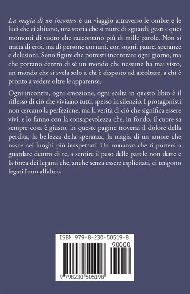La magia di un incontro è un viaggio attraverso le ombre e le luci che ci abitano, una storia che si nutre di sguardi, gesti e quei momenti di vuoto che raccontano più di mille parole. Non si tratta di eroi, ma di persone comuni, con sogni, paure, speranze e delusioni. Sono figure che potresti incontrare ogni giorno, ma che portano dentro di sé un mondo che nessuno ha mai visto, un mondo che si svela solo a chi è disposto ad ascoltare, a chi è pronto a vedere oltre le apparenze. Ogni incontro, ogni emozione, ogni scelta in questo libro è il riflesso di ciò che viviamo tutti, spesso in silenzio. I protagonisti non cercano la perfezione, ma la verità di ciò che significa essere vivi, e lo fanno con la consapevolezza che, in fondo, il cuore sa sempre cosa è giusto. In queste pagine troverai il dolore della perdita, la bellezza della speranza, la magia di un amore che nasce nei luoghi più inaspettati. Un romanzo che ti porterà a guardare dentro di te, a sentire il peso delle parole non dette e la forza dei legami che, anche senza essere esplicitati, ci tengono legati l'uno all'altro.