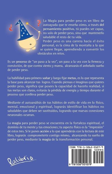 La Magia para perder peso es un libro de autoayuda que te enseña cómo, a través del pensamiento positivo, tú puedes ser capaz, no solo de perder peso, sino que mantenerlo saludable el resto de tu vida. Perder peso es una carrera hacia el éxito personal, es la cima de la montaña a la que se quiere llegar, aprendiendo a convertir los obstáculos en retos. Es un proceso de "un paso a la vez", un paso a la vez con la firmeza y convicción, de que contra viento y marea, alcanzarás el anhelado sueño de perder peso. La habilidad para primero soñar y luego fijar metas, es lo que representa la base para alcanzar tus logros. Cuando piensas e imaginas que quieres perder peso, significa que posees la capacidad de hacerlo realidad, si tus metas son claras, evitarás la pérdida de energía y tiempo durante el proceso que conlleva perder peso. Mediante el autoanálisis de tus hábitos de estilo de vida en lo físico, mental, emocional y espiritual, lograrás identificar los hábitos no saludables que deben ser sustituidos, logrando que nuevas conexiones neuronales ocurran. La magia para perder peso se encuentra en la fortaleza espiritual, el dominio de tu mente y tus emociones; tu aspecto físico es la "impresión" de estos tres. Si le pones acción a lo que aprenderás con la lectura de este libro, lograrás comprometerte contigo mismo, alcanzando tu sueño de perder peso, mediante la magia de la transformación personal.