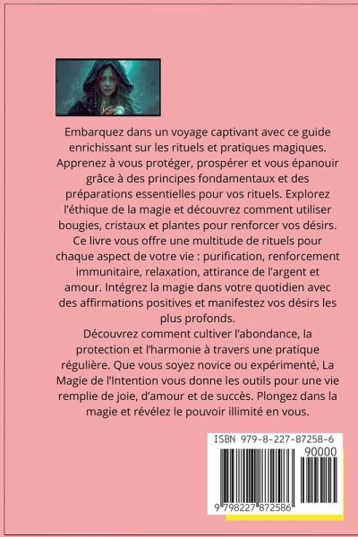 Découvrez le pouvoir de la magie pour transformer votre vie. Ce livre captivant vous emmène dans un voyage pleinement enrichissant à travers des rituels puissants et des pratiques magiques qui vous permettront de vous protéger ainsi que de protéger votre entourage mais aussi de prospérer et de vous épanouir. Plongez-vous dans les principes fondamentaux de la magie et apprenez comment préparer votre esprit et votre espace avant de pratiquer un rituel. Explorez l'éthique et la responsabilité qui guident votre pratique magique, en découvrant comment utiliser les bougies, les cristaux, les plantes et d'autres symboliques pour renforcer vos désirs. Du rituel de purification et de renforcement du système immunitaire au rituel de relaxation profonde pour soulager le stress et l'anxiété, en passant par le rituel d'attirance de l'argent et le rituel lié à l'amour, vous trouverez une multitude de rituels pour tous les aspects de votre vie. Apprenez comment intégrer la magie, en gardant une attitude positive et confiante, en répétant ces affirmations et en manifestant vos désirs les plus enfouis au plus profond de votre coeur. Découvrez comment maintenir l'équilibre et l'harmonie dans tous les domaines de votre vie. En vous plongeant dans ce livre, vous découvrirez les bienfaits de cette pratique régulière et comment vous pourrez les utiliser pour cultiver l'abondance, la protection et l'épanouissement dans votre vie. Embrassez la magie et ouvrez-lui les portes pour profiter pleinement de cette réalité enrichissante et régénératrice. Que vous soyez novice ou expérimenté, la Magie de l'Intention est un guide précieux qui vous offre les outils nécessaires afin de vous apporter une vie remplie de joie, d'amour inconditionnel et de succès dans tous les domaines. Plongez dans la magie et laissez-vous absorber par le pouvoir illimité qui réside en chacun de nous.