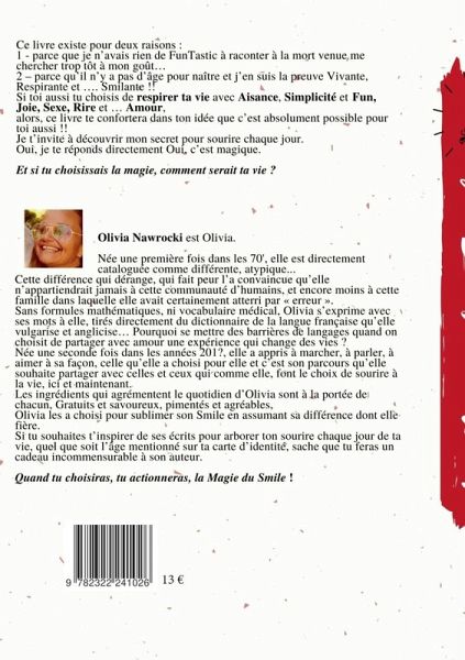 Olivia Nawrocki est .... Olivia, Née une première fois dans les 70', elle est directement cataloguée comme différente, atypique. Cette différence qui dérange, qui fait peur l'a convaincue qu'elle n'appartiendrait jamais à cette communauté d'Humains et encore moins à cette famille dans laquelle, elle avait certainement atterri par "erreur". Sans formules mathématiques, ni vocabulaire médical, Olivia s'exprime avec ses mots à elle, tirés directement du dictionnaire de la langue française qu'elle vulgarise et anglicise.. Pourquoi se mettre des barrières de langages quand on choisit de partager avec amour une expérience qui change des vies ? Née une seconde fois dans les années 201?, elle a appris à marcher, à parler, à aimer à sa façon, celle qu'elle a choisi pour elle et c'est son parcours qu'elle souhaite partager avec celles et ceux qui, comme elle, font le choix de sourire à la vie. Les ingrédients qui agrémentent le quotidien d'Olivia sont à la portée de chacun. Gratuits et savoureux, pimentés et agréables, Olivia les a choisi pour sublimer son sourire en assumant désormais sa différence avec fierté. Si tu souhaites t'inspirer de ses écrits pour t'aider à arborer ton sourire chaque jour de ta vie et quel que soit l'âge mentionné sur ta carte d'identité, sache que tu feras un cadeau incommensurable à son auteur. Quand tu choisiras, tu actionneras directement, la Magie du Smile.