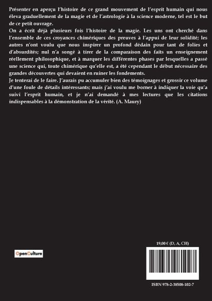 Présenter en aperçu l¿histoire de ce grand mouvement de l¿esprit humain qui nous éleva graduellement de la magie et de l¿astrologie à la science moderne, tel est le but de ce petit ouvrage. On a écrit déjà plusieurs fois l¿histoire de la magie. Les uns ont cherché dans l¿ensemble de ces croyances chimériques des preuves à l¿appui de leur solidité; les autres n¿ont voulu que nous inspirer un profond dédain pour tant de folies et d¿absurdités; nul n¿a songé à tirer de la comparaison des faits un enseignement réellement philosophique, et à marquer les différentes phases par lesquelles a passé une science qui, toute chimérique qüelle est, a été cependant le début nécessaire des grandes découvertes qui devaient en ruiner les fondements. Je tenterai de le faire. J¿aurais pu accumuler bien des témoignages et grossir ce volume d¿une foule de détails intéressants; mais j¿ai voulu me borner à indiquer la voie qüa suivi l¿esprit humain, et je n¿ai demandé à mes lectures que les citations indispensables à la démonstration de la vérité. (A. Maury)
